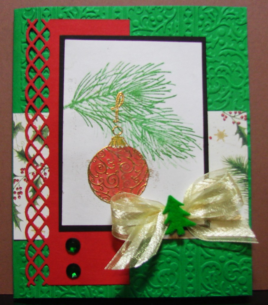 I seldom use this glorious green, as it is my least favorite color of all greens, but pulled it out for a traditional Christmas card. I stamped the pine needles with cottage ivy (Memento) and the ornament in Versamark and then covered it with gold embossing powder. I embossed the green card base with one of the new larger cuttlebug folders. I used some ribbon and a flock covered tree brad for my embellishments. A Martha Stewart punch was used on the real red panel, with green rhinestones to add a little sparkle.