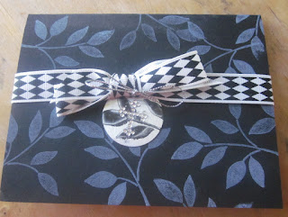 This was a fun and easy card. I love black and white color combos, and I had just recently bought this ribbon that I found for 40% off. The tag is a silver metal cut in a circle. I stamped black leaves on it with black StazOn. The white leaves on the black cardstock is SU white. I stuck on the cross rhinestone as an additional embellishment.You can find this challenge here.